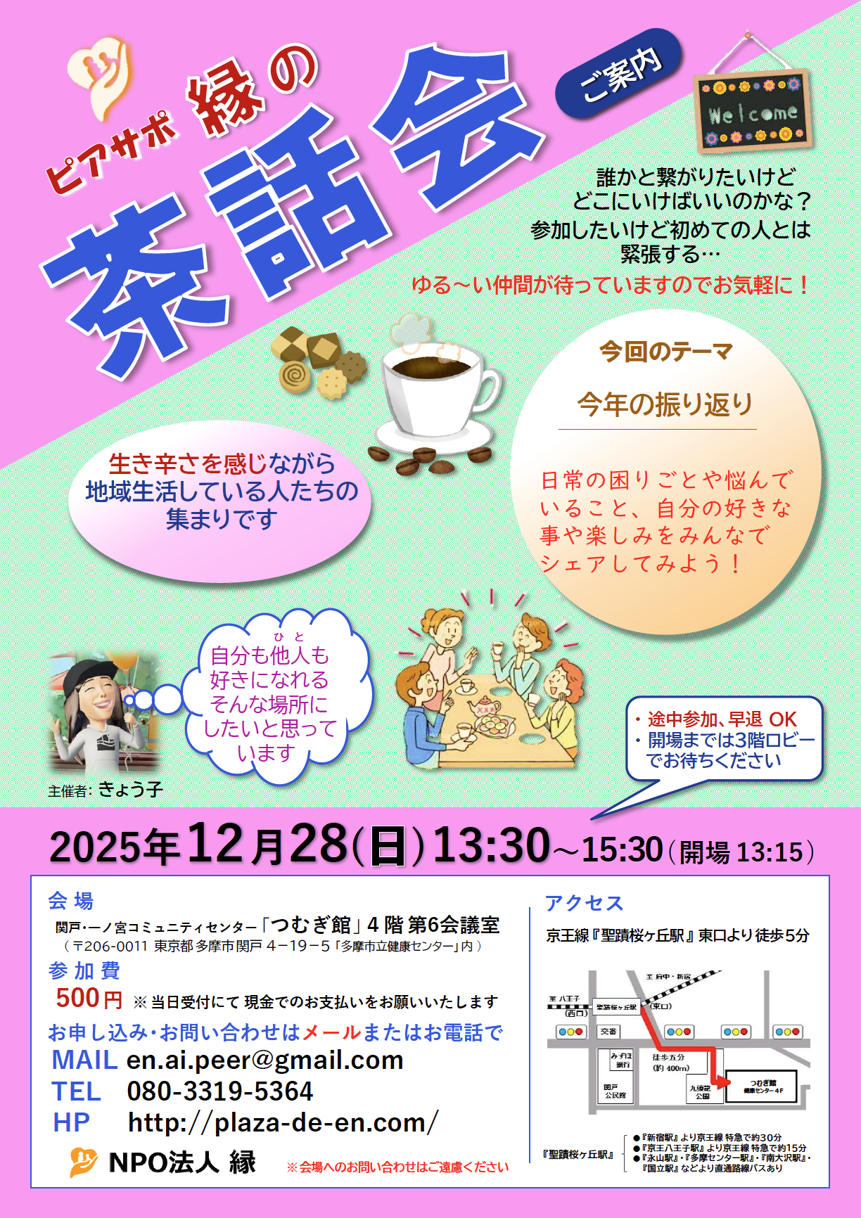 | 2021年 | 東京都しごと財団障害者委託所にてピアカウンセリング、WRAP講座担当 オンライン茶話会、WRAP定期クラス開催 精神科病院において動画でリカバリーストーリーの発表 月数回出張茶話会、出張WRAP開催 多摩市権利擁護部会委員に就任 NPO法人縁設立 |
